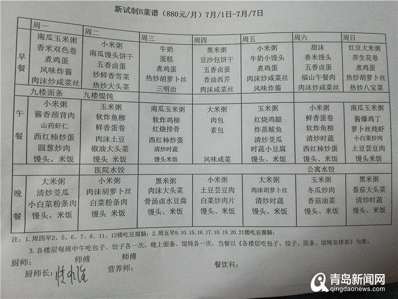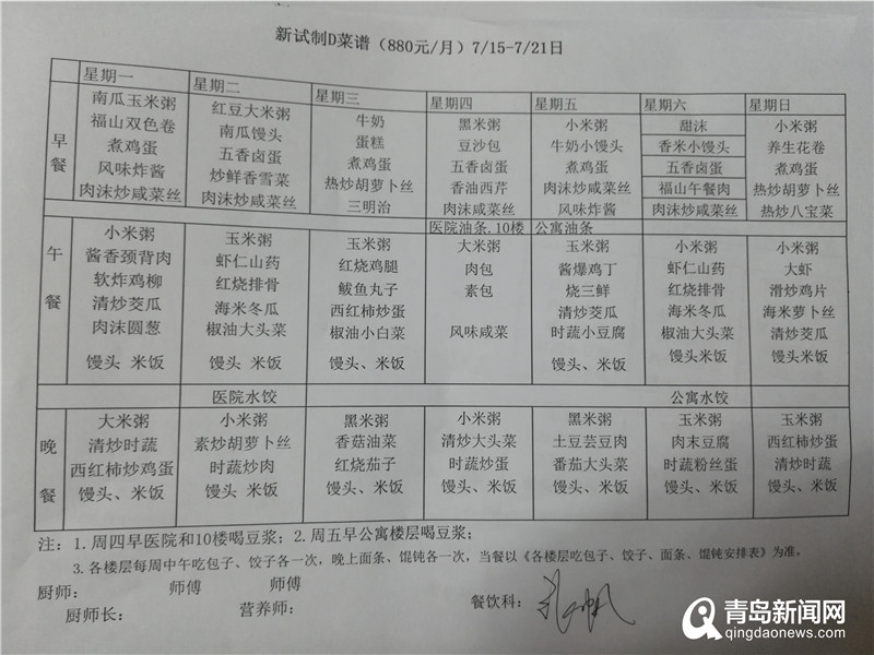 福山老年公寓王院长告诉记者,收到这一信息后公寓内部十分重视,对帖子中提到的问题进行核查。首先是饮食质量问题,帖子中提到的“饺子里有骨头渣”、“炖肉变质有异味”、“玉米碴子饭、麦粒饭”的情况不存在。关于每天食谱的制定,王院长表示,养老院与中食安心食品管理有限公司合作,根据老年人所需营养配比和时令蔬菜制定,做到蛋白质、脂肪、碳水化合物配比合理。