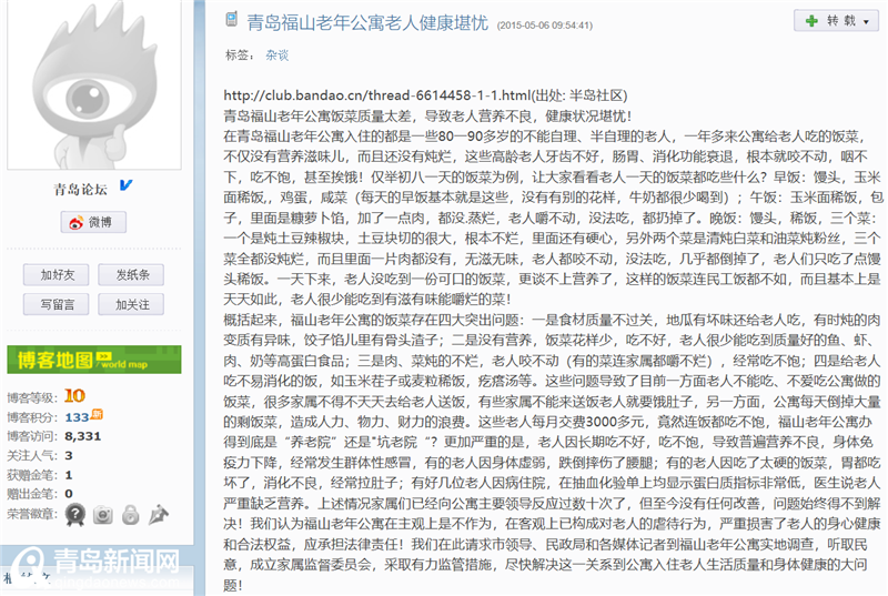 记者联系了发帖人,他表示并不是自家老人在福山养老院,帖子是从微博转载的。记者到网上搜索发现,2015年5月6日,ID为【青岛论坛】的用户发表过一篇内容大体一致的博文。