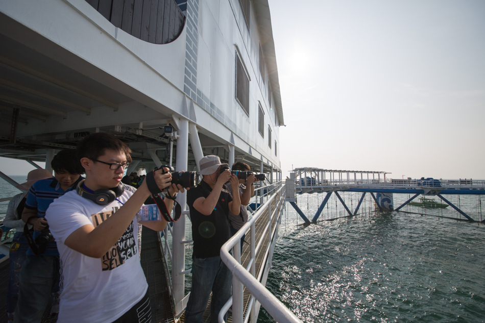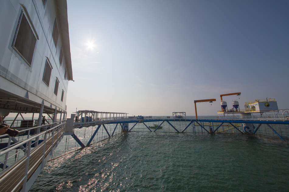 网箱上方建筑采用别墅设计,采用高标准“中国风”装修风格。“这是我们特意定制的,更好地使旅游业和渔业真正结合,”宋守刚说,“这里还可以供游客休闲垂钓。在平台两侧分别布置有150平方米的设备间和400平方米的生活区,可让游客亲身体验高科技养鱼过程。”