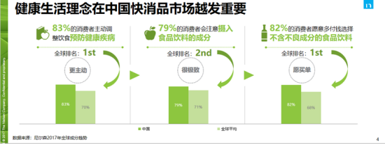 “收入水平的提升成为了驱使人们追逐品质生活的根源”。《报告》显示,在消费理念上,健康生活的理念在中国快消饮料市场倍受推崇。与全球消费者相比,83%的中国消费者会主动调整饮食以预防健康疾病,高出全球平均13个百分点,他们对健康食品和饮料也更为重视,更有消费意愿。尼尔森数据显示,79%的消费者会注意摄入食品和饮料的成分,82%的消费者愿意多付钱选择安全成分的食品和饮料,而全球平均值仅为68%。