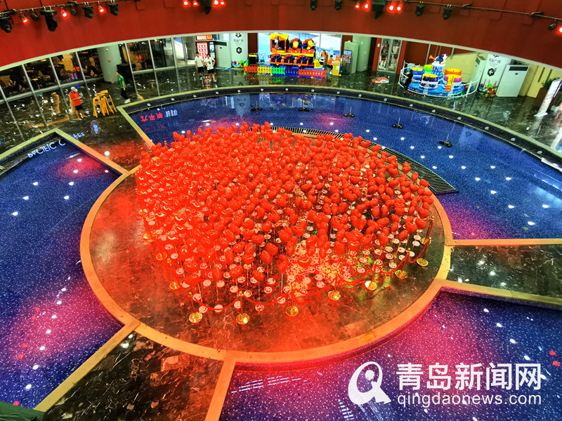 乐客城在B1的中心舞台用红色心形气球摆出了一圈心形图案,可供顾客打卡拍照。