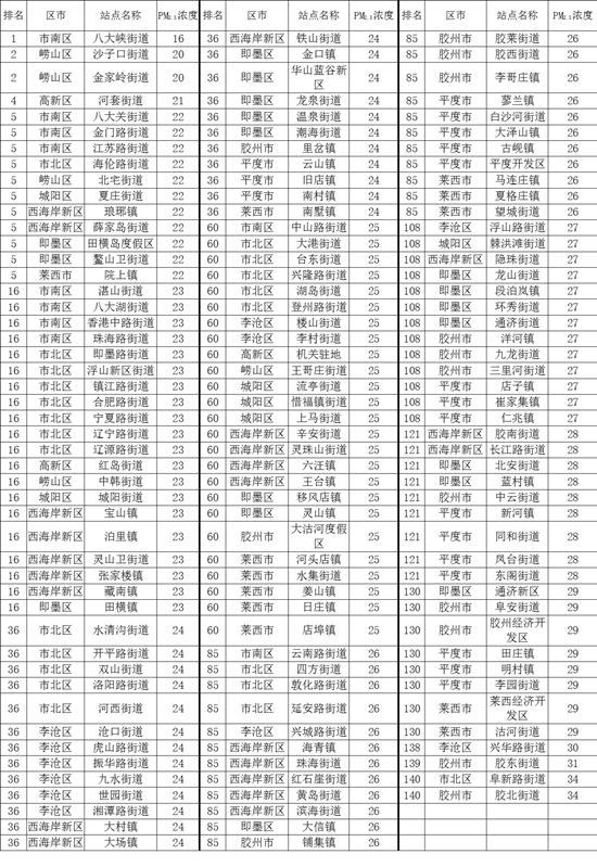 PM2.5浓度由好到差排名前10名的是:市南-八大峡街道(第1)、崂山-沙子口街道(并列第2)、崂山-金家岭街道(并列第2)、高新-河套街道(第4)、市南-八大关街道(并列第5)、市南-金门路街道(并列第5)、市南-江苏路街道(并列第5)、市北-海伦路街道(并列第5)、崂山-北宅街道(并列第5)、城阳-夏庄街道(并列第5)、西海岸-琅琊镇(并列第5)、西海岸-薛家岛街道(并列第5)、即墨-田横岛度假区(并列第5)、即墨-鳌山卫街道(并列第5)、莱西-院上镇(并列第5);排名后10名的是:即墨-通济新区(并列倒数第5)、胶州-阜安街道(并列倒数第5)、胶州-胶州经济开发区(并列倒数第5)、平度-田庄镇(并列倒数第5)、平度-明村镇(并列倒数第5)、平度-李园街道(并列倒数第5)、莱西-莱西经济开发区(并列倒数第5)、莱西-沽河街道(并列倒数第5)、李沧-兴华路街道(倒数第4)、胶州-胶东街道(倒数第3)、市北-阜新路街道(并列倒数第1)、胶州-胶北街道(并列倒数第1)。