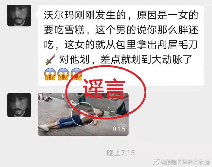 2019年8月15日,本地微信群流传一则视频信息,称:“沃尔玛刚刚发生的,原因是一女的要吃雪糕,这个男的说你那么胖还吃,这女的就从包里拿出刮眉毛刀对他划,差点就划到大动脉了”。经网警核实,本地未接到相关报警和警情,真实情况系2019年8月14日10时,河南省驻马店市风光路上海商城附近一男子被人捅伤,后经抢救无效死亡。随后,相关视频在微信群、朋友圈流传,引起各地网民转发与讨论。襄阳网警提醒大家:不信谣,不传谣!恶意传播谣言将受法律惩处。
