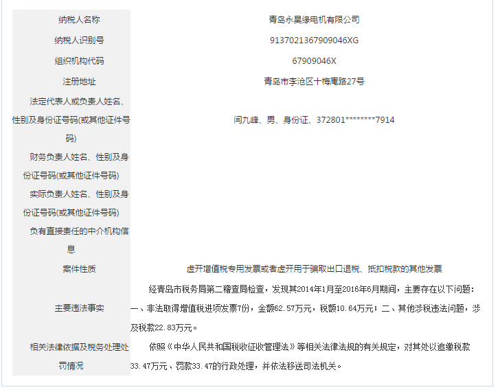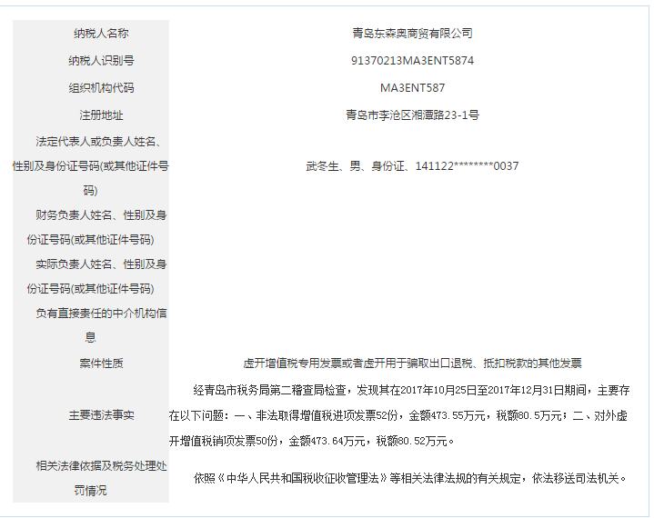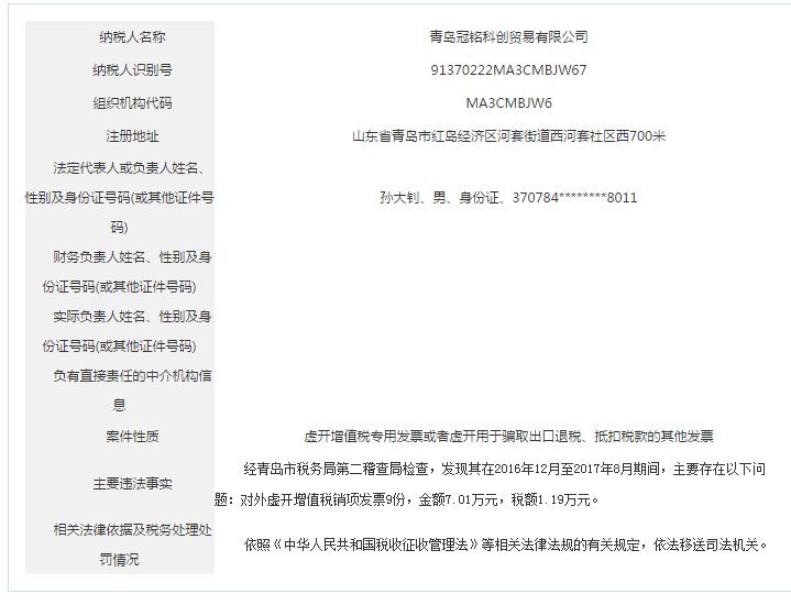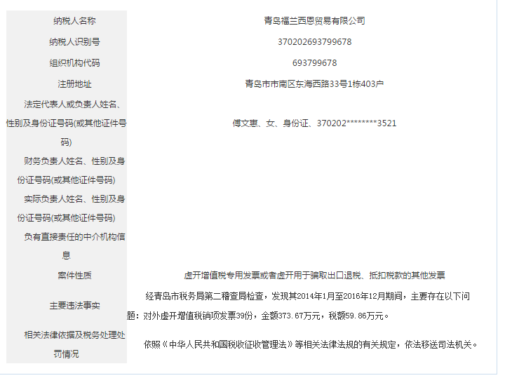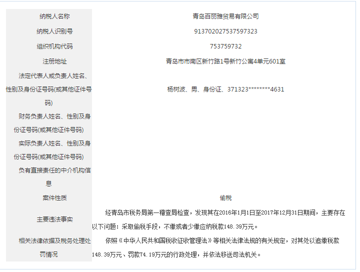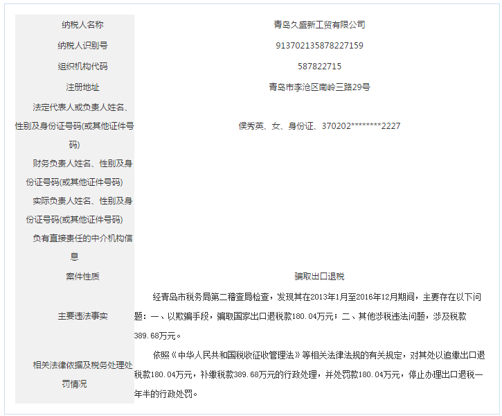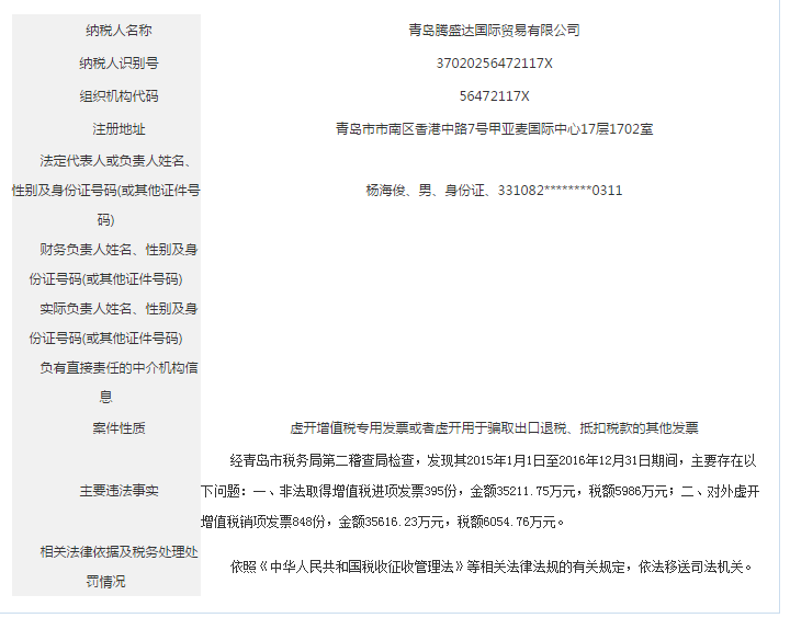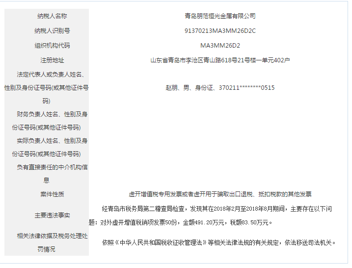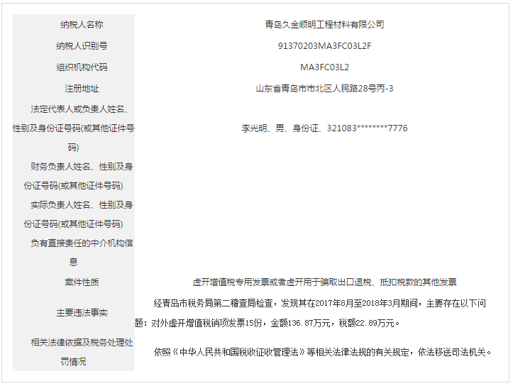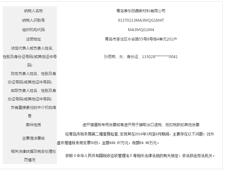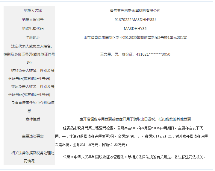 青岛税务局公告青岛鑫宝来钢铁有限公司等59起重大税收违法案件