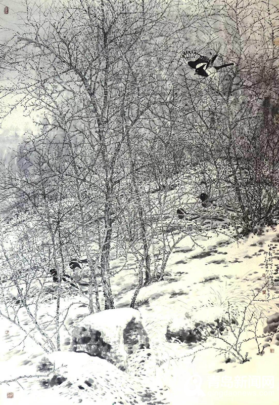 本次展览的作品除了国画《寒林欢歌》、水彩《芳草》等近期创作的代表作,还有20余幅他与张杰三、徐立忠、薛益寿等名家共同创作的作品。