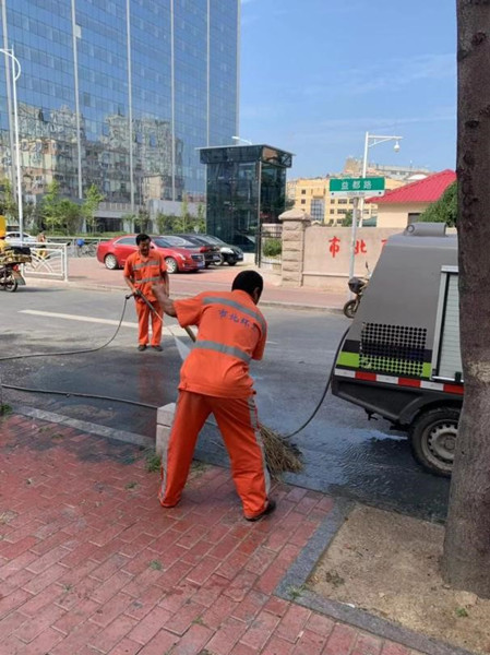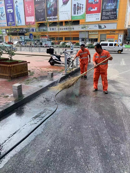 工人们顶着烈日和刺鼻的异味,使用洒水车边洒水边用扫帚一点一点的将厚达2厘米的污水淤泥清理干净。之后再多次反复冲洗路面,经过工人们40多分钟的集中清理,最终使现场道路恢复原貌。