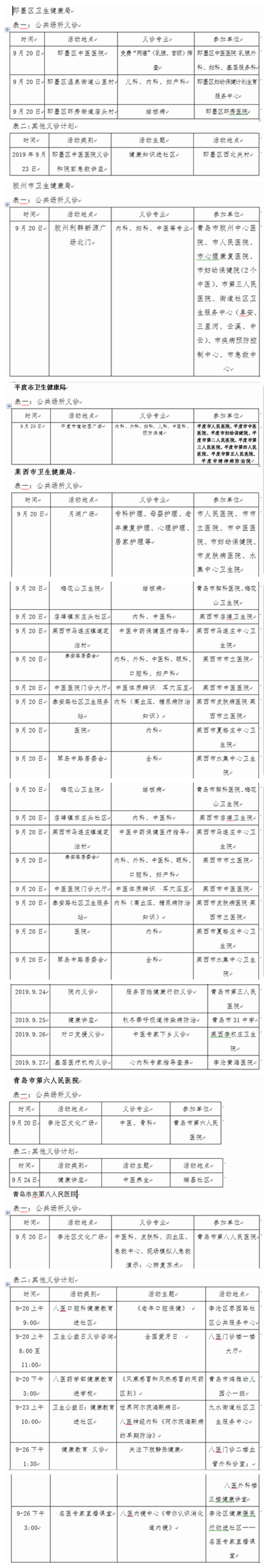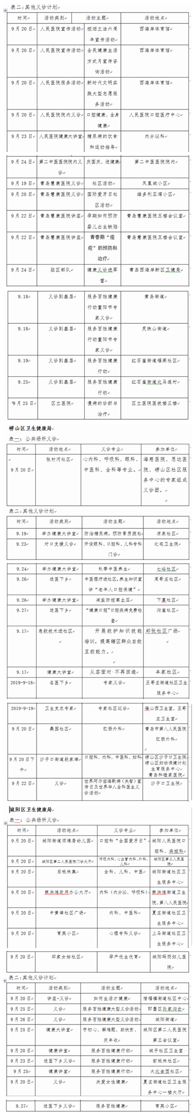 2019年青岛市“服务百姓健康行动”义诊活动周计划表
