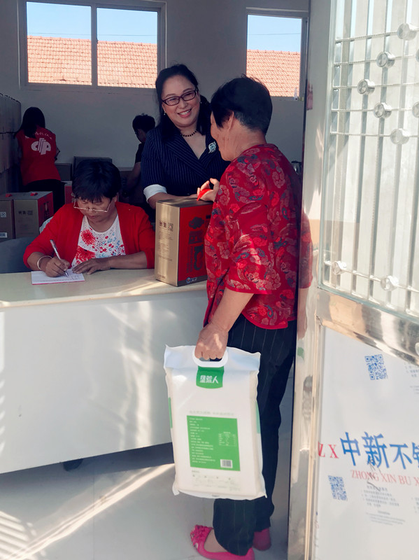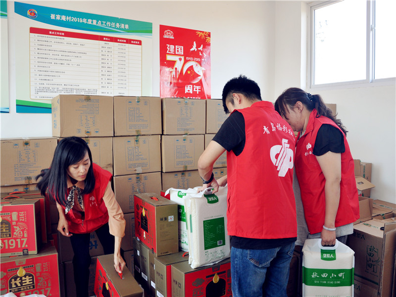 青岛市福利彩票发行中心的社工及志愿者为村里60岁以上老人送上大米、花生油等生活物资。