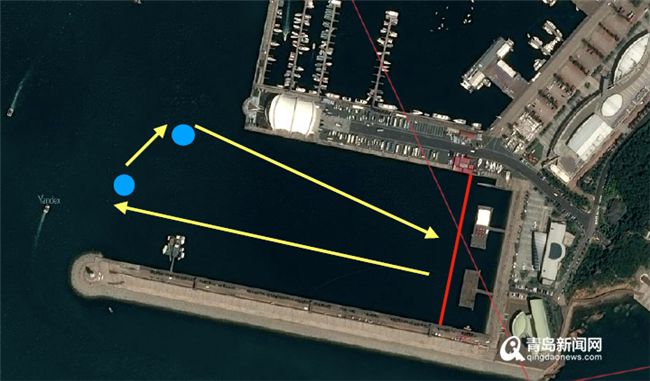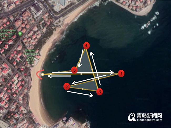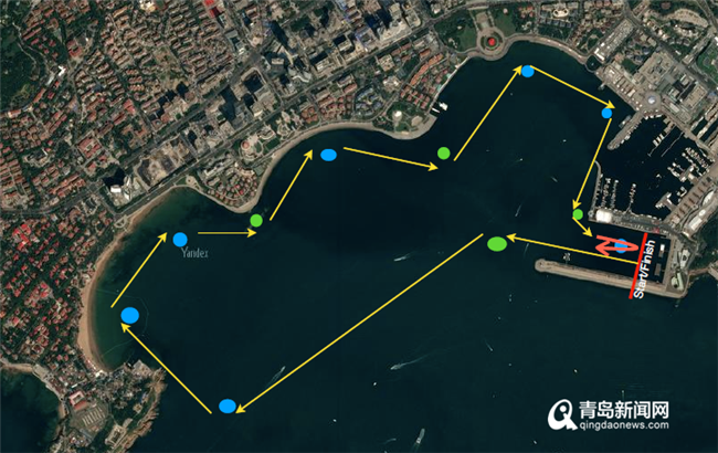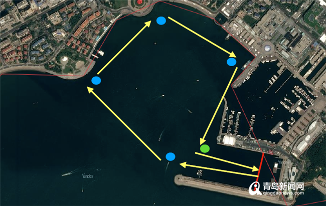 比赛地点:奥帆中心外港池到三浴、五四广场沿线,沿下图比赛路线绕行三圈,共18公里,起终点在奥帆中心外港池。