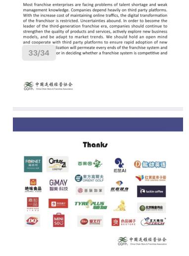作为国际特许经营大会的重要成员,中国特许经营协会本次的报告主题是《Build to win:3G Ditital Franchise Report》,分享了中国特许经营在数字化方面的进程。报告指出企业经营应以消费者中心,开启新消费时代,导入新消费价值观,实现数字化转型。