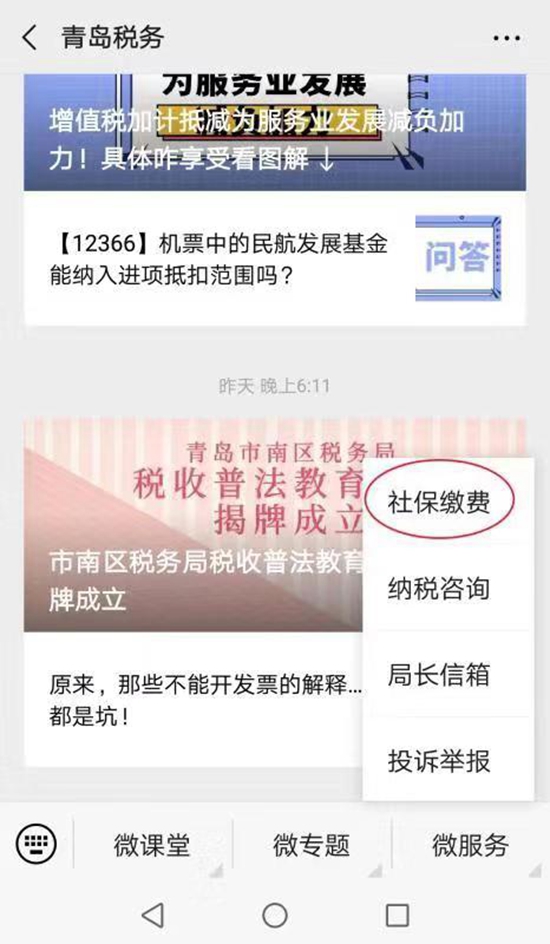 从今年1月1日城乡居民社会保险费征管职责划转以来,青岛市税务局立足缴费人需求,多角度优化服务,全方位提升居民缴费体验,积极拓展新的缴费渠道。前期,市税务局在保留原有银行线下缴费渠道的基础上,拓展了工商银行、中国银行、交通银行、招商银行等网上银行和手机银行等缴费方式。31日起,微信缴费功能实现后,缴费人只需在街保中心办理缴费核定,通过关注“青岛税务”微信公众号,点击“微服务——社保缴费”即可缴纳城乡居民社会保险费。除以上方式外,缴费人还可选择银行扣款(批扣)、税税通APP,电子税务局、服务大厅等方式缴纳城乡居民两险。