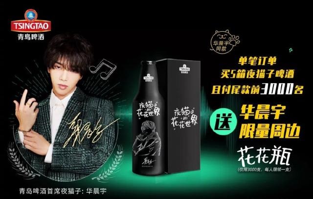 好歌用心打磨,好酒精心慢酿。青岛啤酒邀华晨宇出任“首席夜猫子”,更带来了限量款花花瓶,满足花花粉丝的收藏需求。单笔订单满5箱,且付尾款前3 000名的粉丝,均可以得到一支华晨宇限量周边花花瓶。