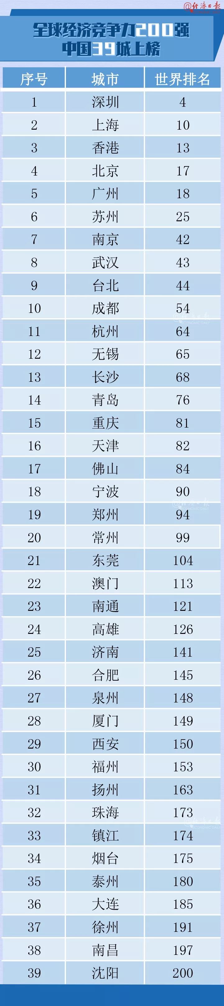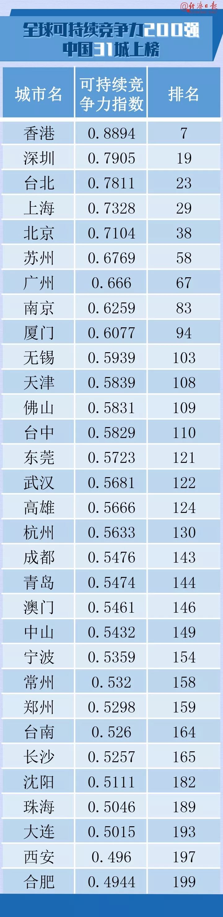 特别要注意的是,报告明确指出,2019年中国城市经济竞争力排名升少降多,东部沿海城市和中部地区的城市经济竞争力水平升多降少。2019年,中国291个城市中有103个城市经济竞争力水平排名上升,182个城市经济竞争力排名下降,尤其是欠发达的西部地区和东北地区的资源型城市降多升少,要引起重视!全球可持续竞争力200强城市可持续竞争力,是指一个城市提升自身在经济、社会、生态、创新、全球联系等方面的优势,并寻求系统优化,以持续满足公民复杂而高级的福利效用的能力。简单说,城市可持续竞争力就是衡量居民福利的规模、水平和增长。报告显示,虽然中国城市在可持续竞争力方面与西方发达国家的城市相比还有些差距,但近年来我国城市的可持续竞争力在稳步提升,不仅31座城市跻身前200强,香港、深圳更是挤进了前20强。在这份榜单上,青岛排名第144。