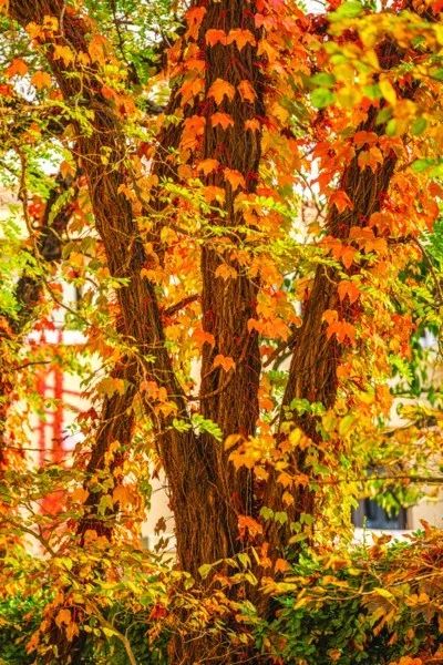 诸多的摄影师将这里列为取景地,一对对新人在此留下了最美的回忆。除了银杏树,道路两侧还有大量的红枫,在这个季节树叶已经变红,米白建筑色和红黄色搭配起来更让人感受到了季节的变换。