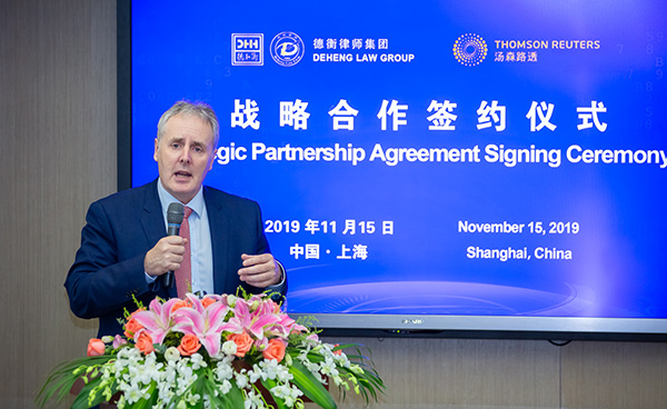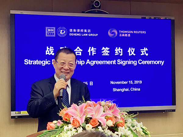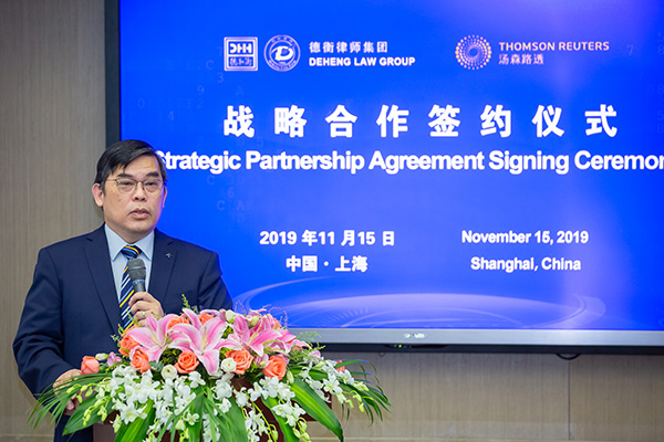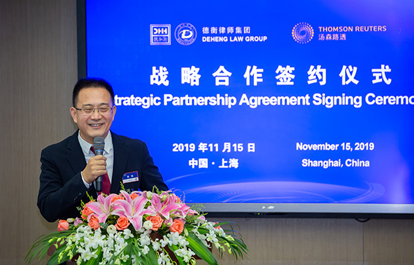 德衡律师集团合伙人会议主席栾少湖继而用致辞开启了当天的签约仪式。他欢迎并感谢了各位嘉宾的到场。栾主席提到,德衡集团于2018年启动了和汤森路透的合作讨论,此次以软件升级为核心的整体集团升级转型,在德衡内部被称为“超级2020”计划,而这一计划也在今天迎来了正式启动。此次和汤森路透的战略合作不但将提高德衡的服务能力和经营收益,未来也将把中国最优秀的法律人才吸引聚拢在德衡旗下。此次合作激动人心,也极大考验着双方的执行力,衷心期待德衡和汤森路透共同完成这项“伟大而艰巨的任务”。