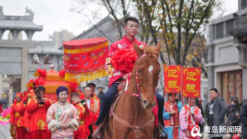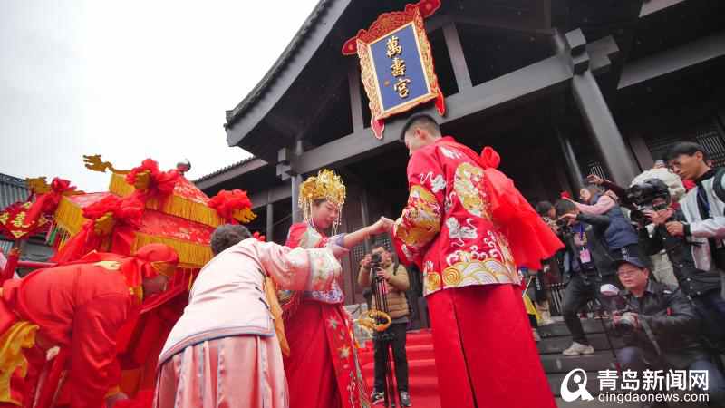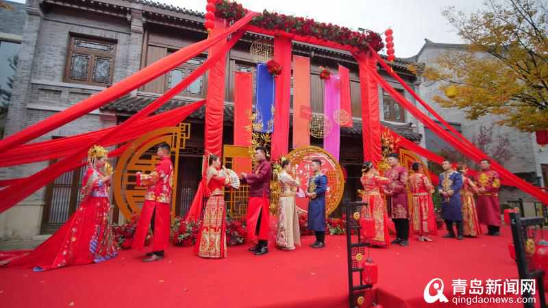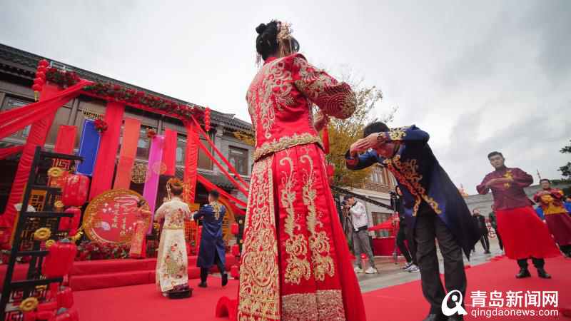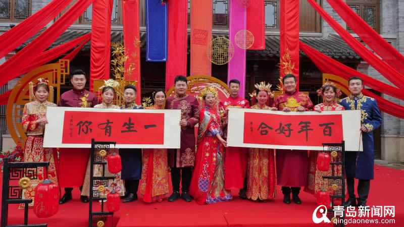跨马鞍、雀扇礼、印信礼、合卺酒、执手撒帐礼……当天上午,即墨区新时代文明实践——即墨古城集体中式婚礼在君澜度假酒店门前广场举行。6对新人身着传统中式礼服、携手相伴,宛如从古代穿越而来的一对对璧人,用集体婚礼这样一种特殊的文明婚俗行为,见证自己的爱情。
