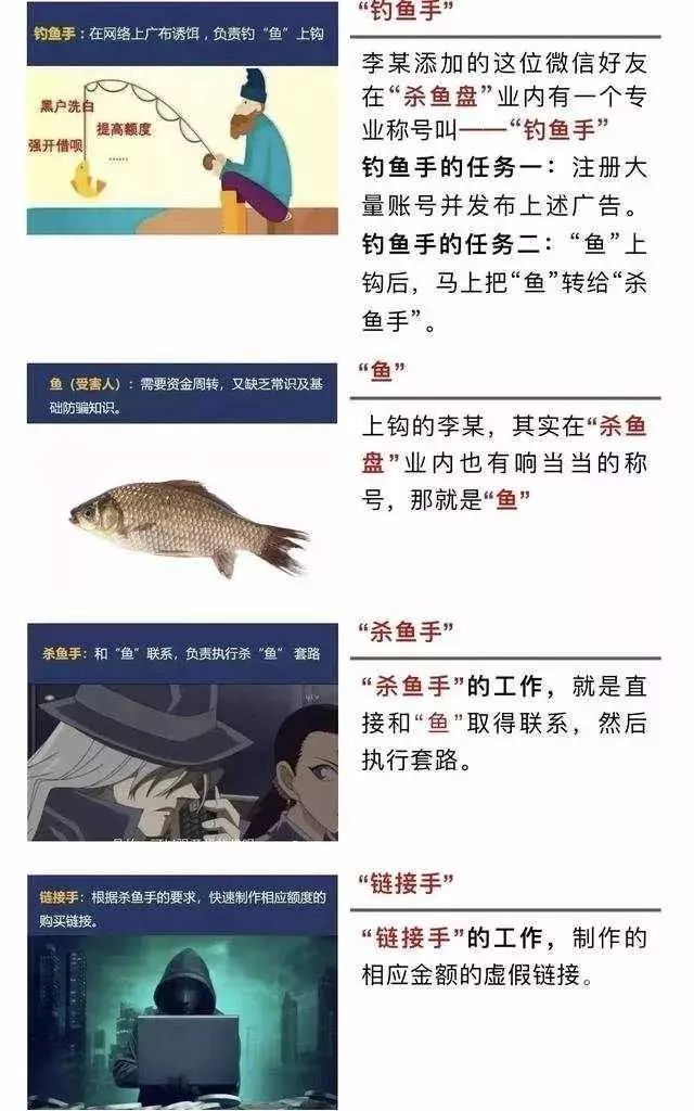“钓鱼手”主要负责引“鱼”上钩,在社交、游戏等网络平台发布虚假广告,骗得“鱼”也就是受害者的信任,然后把“鱼”交给“杀鱼手”,“杀鱼手”来具体实施套路。