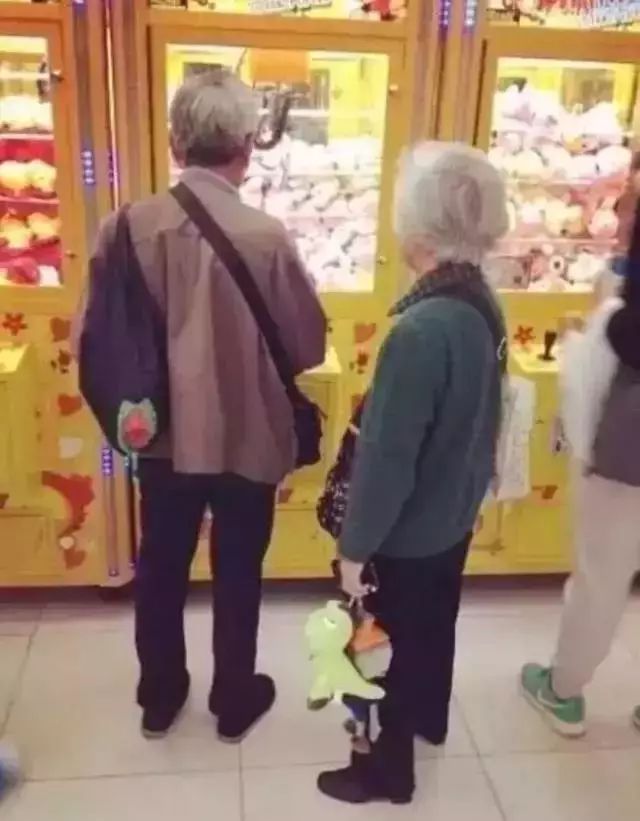老爷爷攥着几枚游戏币,一边研究娃娃机的玩法,一边询问老伴:“喜欢哪个?”