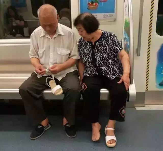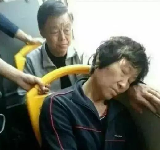公交车上,爷爷怕睡着的奶奶被颠簸磕到,伸出一只手给她枕着。