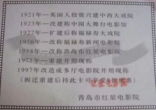 藏友提供的一张“告别中华老字号——红星电影院”的纪念卡,背面有“拆迁重建后持此卡可享受8折优惠”的字样,今天看来只能一声叹息了......