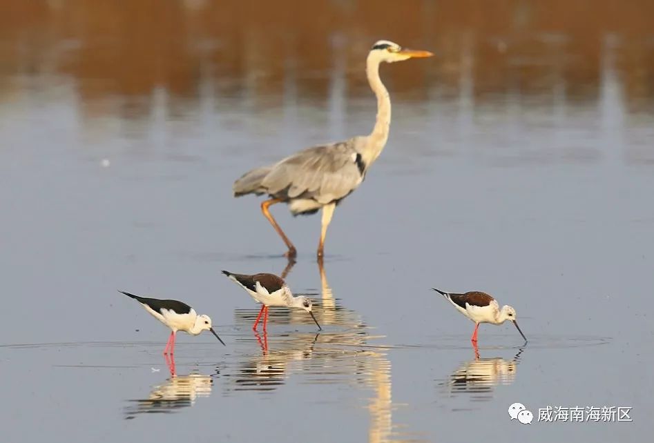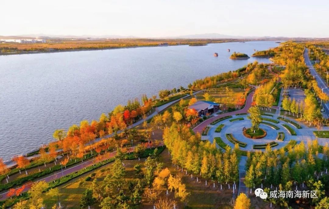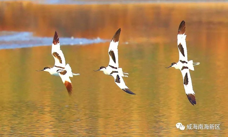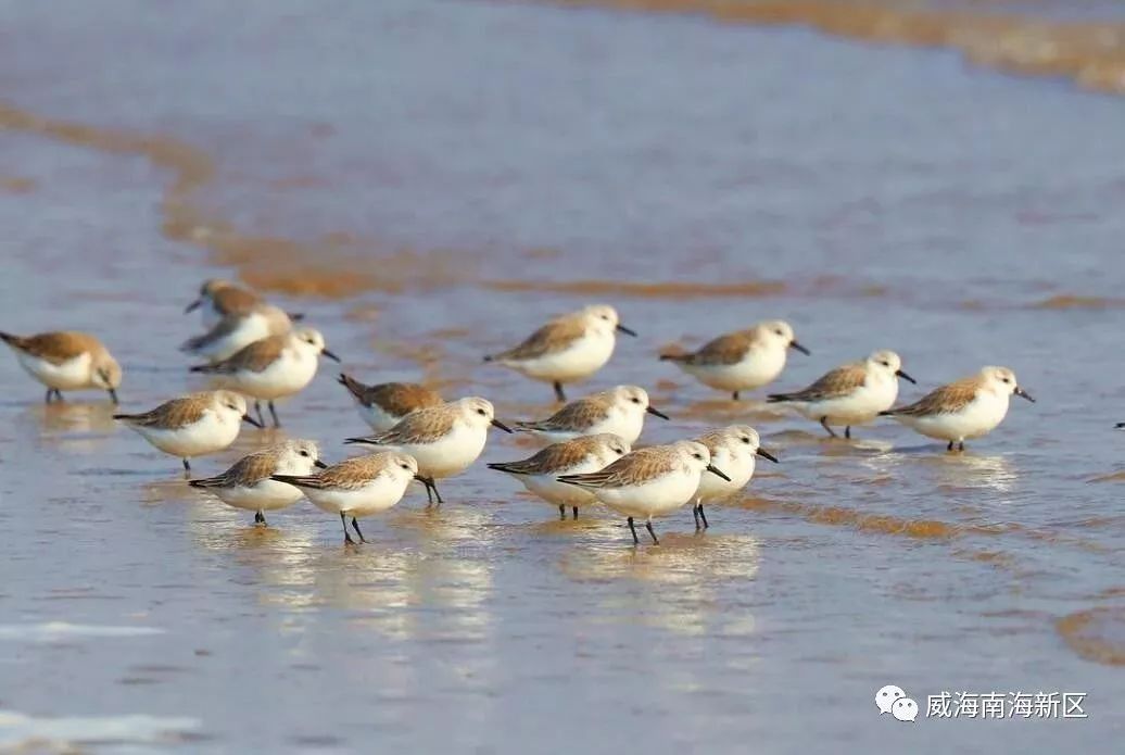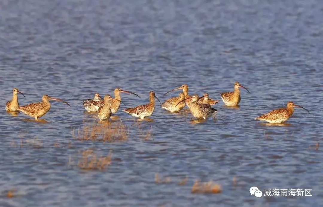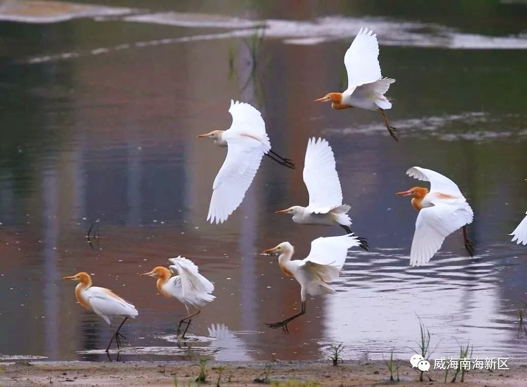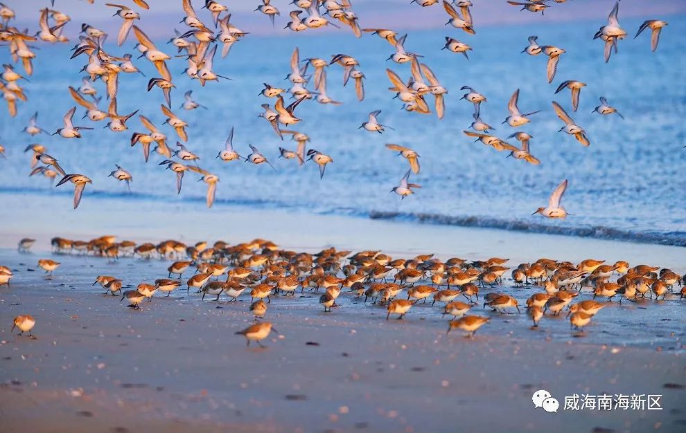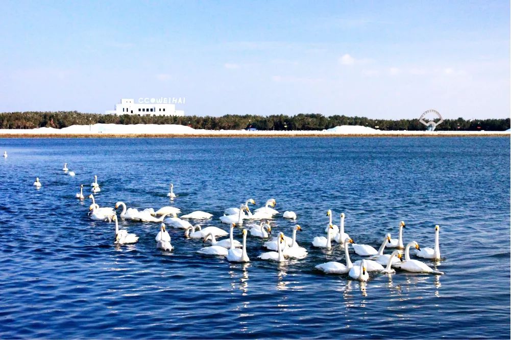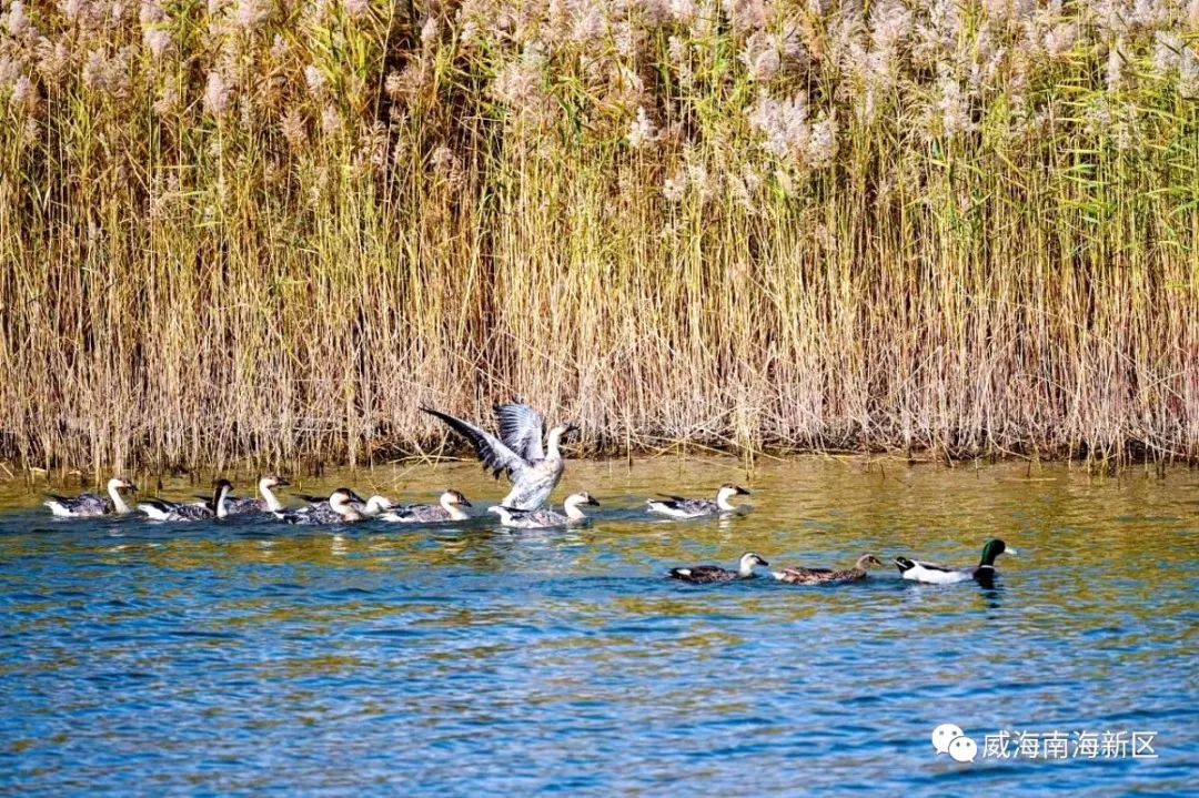 在威海的南海新区,流经这里的香水河、昌阳河、黄垒河三大淡水河,涵养了万亩湿地,沿河两岸风景如画,景幽清秀,静谧祥和,是不被打扰的“鸟类天堂”,每年冬天,有近300多种鸟类来此地栖息过冬。