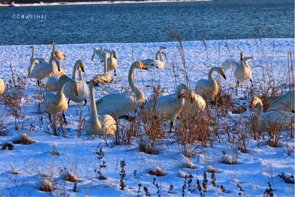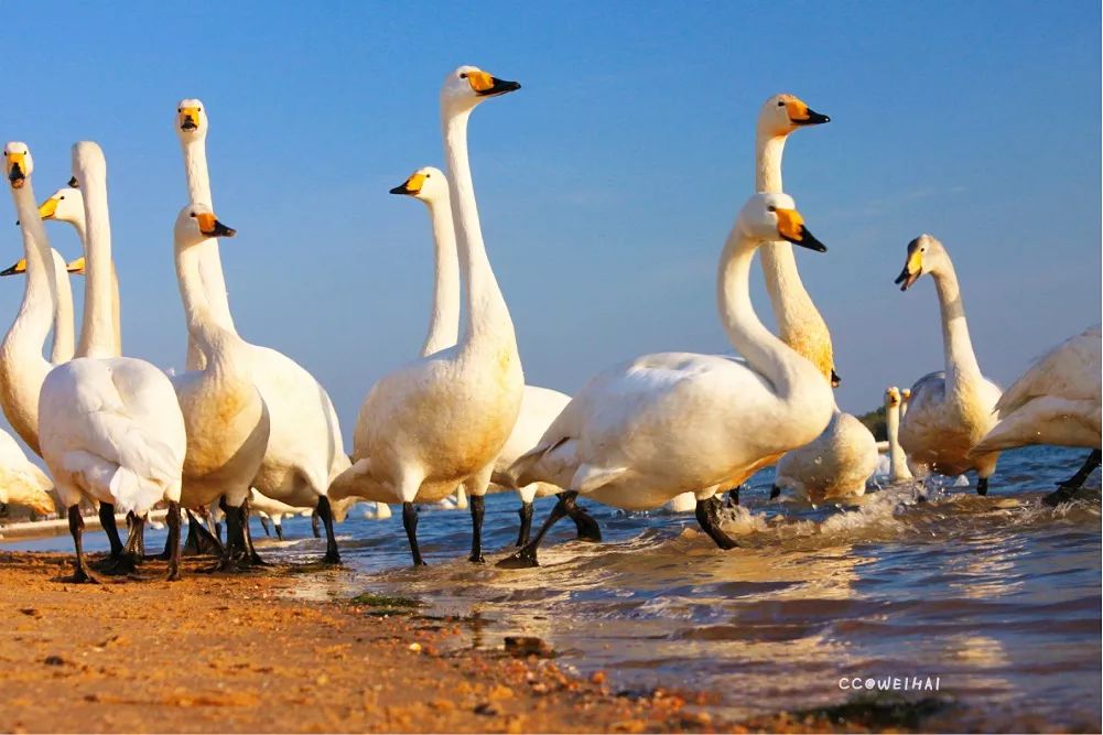 在威海烟墩角,冬日的“天鹅湖”又变得热闹起来。成百上千只大天鹅们从西伯利亚,千里迢迢来到这里,在幽蓝的海面上嬉戏觅食,时而踏浪前行,时而低空盘旋、引吭高歌,上演一曲曲优美的天鹅舞。
