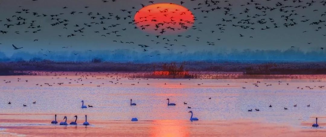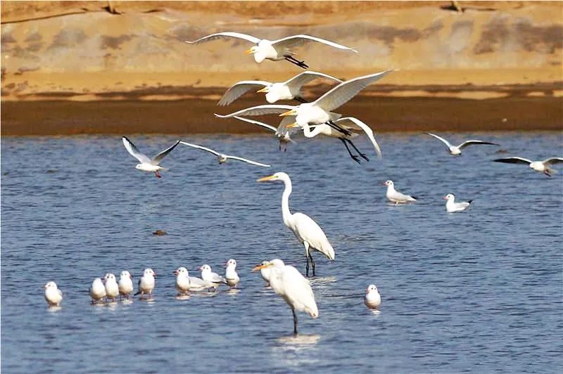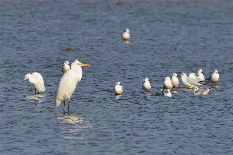 看微澜的水面上,遗鸥、中华秋沙鸭、东方白鹤、白琵鹭、鸳鸯等珍贵的鸟类,成群结队的盘旋飞翔;斑斓各色的鸟群融洽地生活在这里,清脆婉转的鸟鸣声在冬日的晴空中回荡。