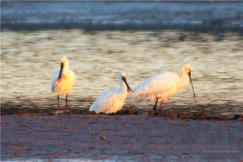 咸咸的海水与淡水交汇所形成的湿地环境,为候鸟们提供了得天独厚的居住条件。夕阳日暮时,漫天的彩霞染红了河滩,宽阔的河面上候鸟齐飞,真有“落霞与孤鹜齐飞,秋水共长天一色”的美景。