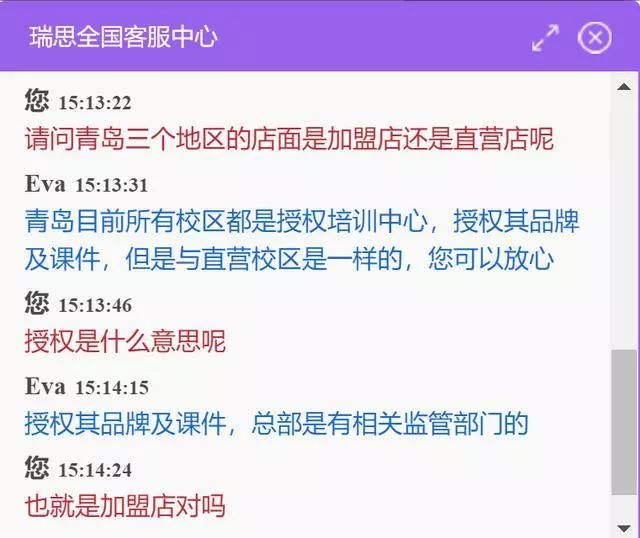 岛城家长听说瑞思英语哈尔滨门店爆雷后,同样心惊胆战,迅速联系各个门店。目前,家长们告诉记者,门店客服答复对于哈尔滨门店事件他们均不知晓,青岛三家门店为统一管理,运营状况良好,并且均为品牌直营店,总部位于北京。但在记者联系瑞思英语全国官网客服询问后得知,青岛三家门店实际上为授权加盟店。随后记者多方联系青岛地区官网400电话与留取的联系人手机号码,截止发稿前均未接听。