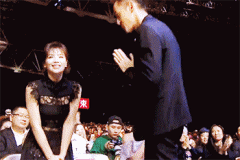 胡歌索性直接跳上去,半跪半趴在地上为她签字。