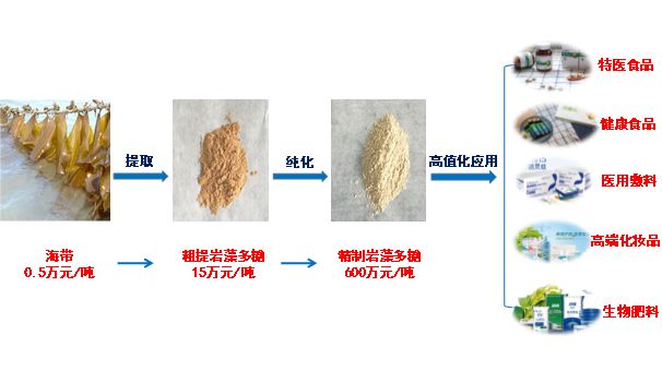 本项目打破国外技术封锁,从价值0.5万元/吨的海带获得价值600万元/吨的海洋生物制品,通过技术创新实现岩藻多糖的多领域、多渠道高值化应用,有效提高海洋资源的附加值;通过拉动上游海藻养殖业促进整个海藻生物产业链可持续发展,最终实现山东半岛蓝色经济稳步增长。