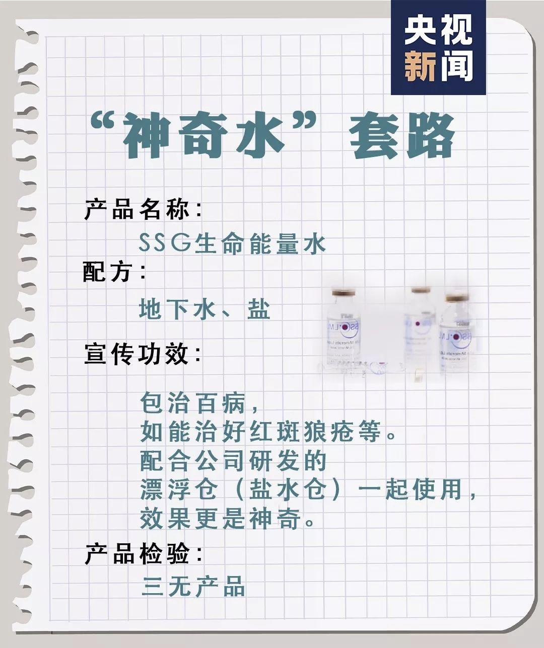 这种神奇的水叫做SSG生命能量水。产品宣传,这是被地壳运动封存起来的远古海洋水,当地人称之为“神水”,得到多家中美权威机构的认可,能逆转衰老、延长寿命,甚至包治百病。整个疗程只需七天,如果再配合公司研发的漂浮舱一起使用,效果更是神奇。