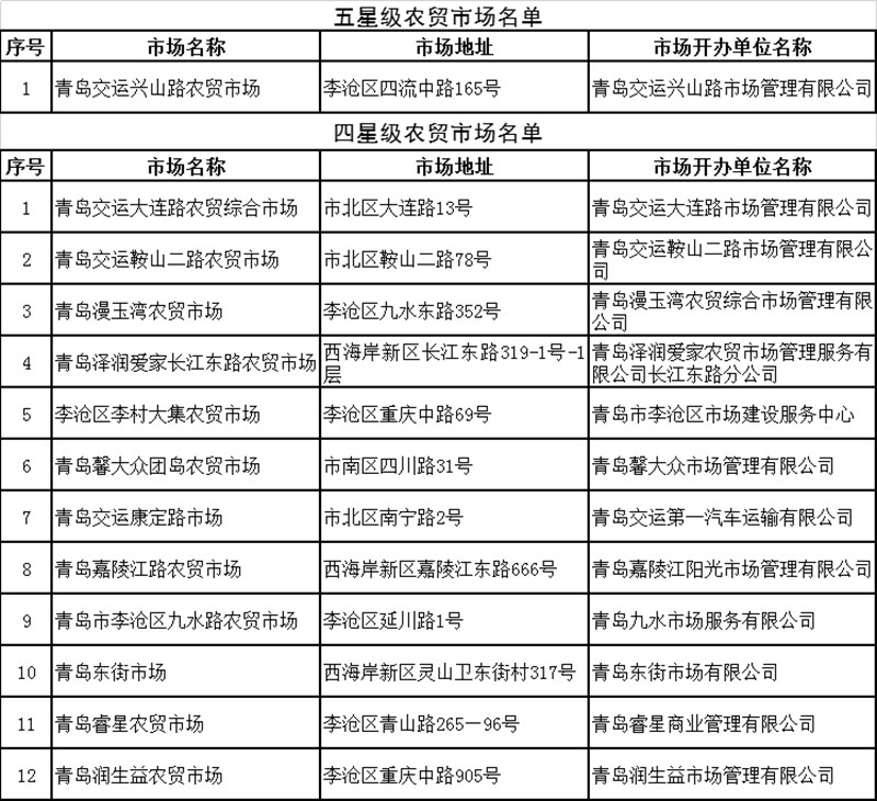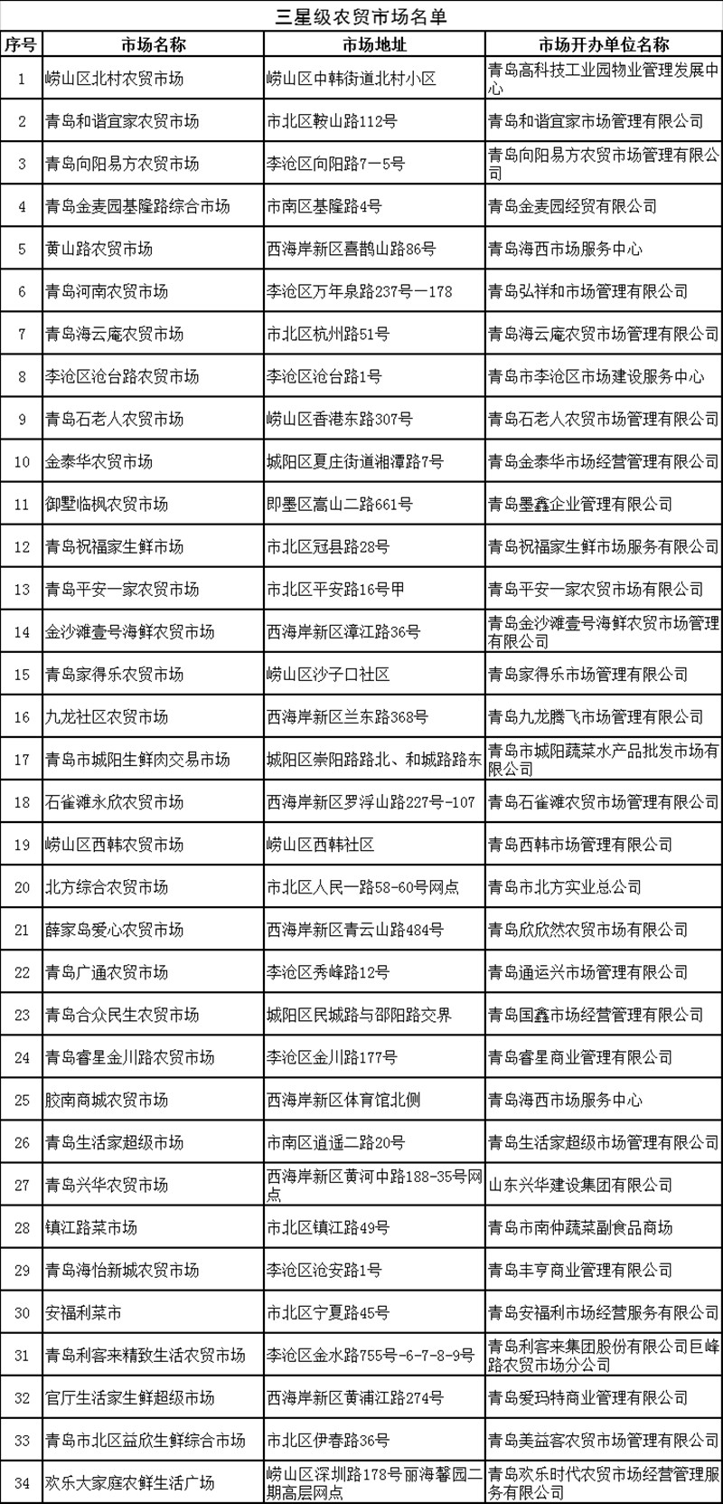 按照市政府《关于2019年重点办好城乡建设和改善人民生活方面10件实事的通知》要求,青岛市市场监管局组织开展了2019年星级农贸市场创建活动,制定了《青岛市2019年星级农贸市场创建办法》,细化了《青岛市2019年星级农贸市场创建标准》,引入第三方机构测评,建立专业考核评审机制。经过市场自评申报、区市场监管局初审、市市场监管局复核、第三方机构实地测评、区市两级创建工作办公室联合集中测评、专家评审等环节,结合市民满意度调查和星级农贸市场候选名单公示期间的市民反馈意见,综合评定出47处“青岛市2019年度星级农贸市场”。