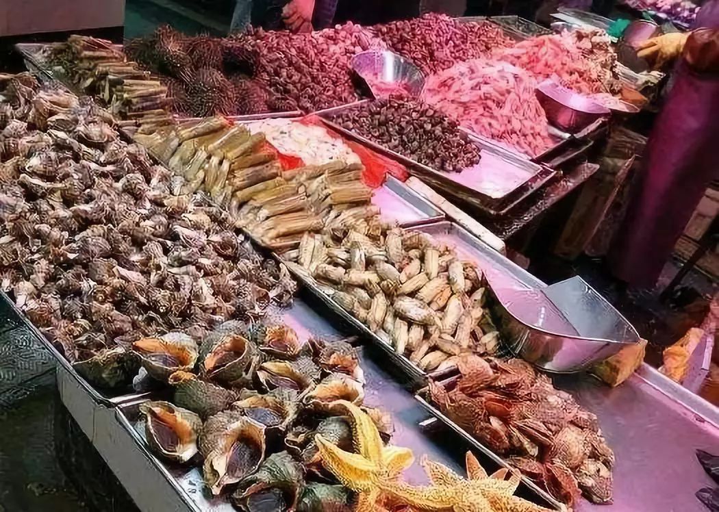 海参、鲍鱼、对虾、鱼翅、螃蟹、扇贝、海螺、以及各种海鱼