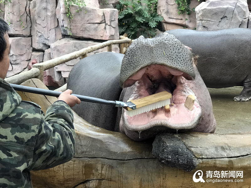 青岛新闻网12月28日讯(记者 张力伟)今日上午,青岛森林野生动物世界的河马宝宝们享受“星级服务”,专业兽医精心调制河马专用漱口水和特制牙膏,现场为河马来了一次全方位洁牙。