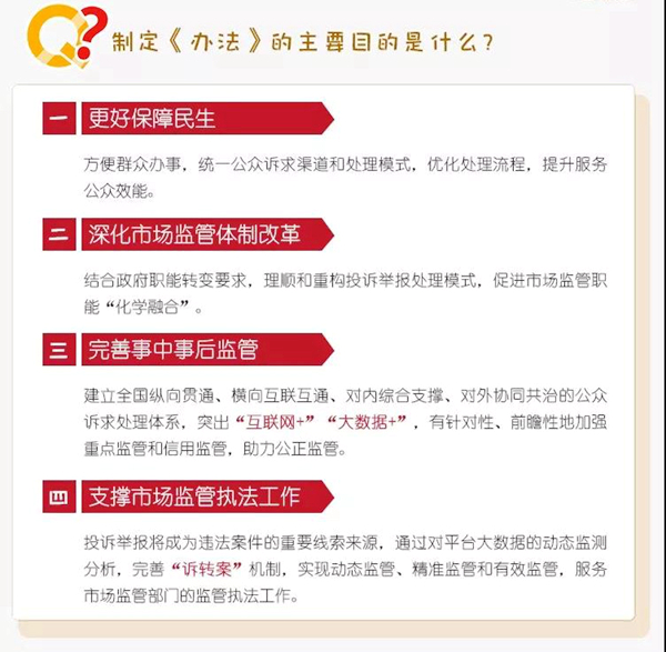 青岛新闻网1月1日讯(记者 黄晓)2019年11月26日,国家市场监督管理总局2019年第15次局务会议审议通过了《市场监督管理投诉举报处理暂行办法》,并于2019年12月2日在官网进行了发布,该《办法》自2020年1月1日起施行。