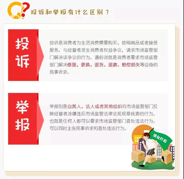 《办法》第三条明确了投诉和举报的区别。投诉是消费者为生活消费需要购买、使用商品或者接受服务,与经者发生消费者权益争议,请求市场监管部门解决该争议的行为,通俗说就是消费者要求市场监管部门解决修理、更换、退货、退款、赔偿损失等自身的民事诉求。举报则是自然人、法人或者其他组织向市场监管部门反映经营者涉嫌违反市场监管法律法规规章线索的行为,也就是任何人都可以要求市场监管部门查处违法行为。可以同时主张民事诉求和查处违法行为。