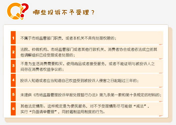 《办法》第十五条明确表示“投诉有下列情形之一的,市场监督管理部门不予受理”,这些情形有:投诉事项不属于市场监督管理部门职责,或者本行政机关不具有处理权限的;法院、仲裁机构、市场监督管理部门或者其他行政机关、消费者协会或者依法成立的其他调解组织已经受理或者处理过同一消费者权益争议的;不是为生活消费需要购买、使用商品或者接受服务,或者不能证明与被投诉人之间存在消费者权益争议的;除法律另有规定外,投诉人知道或者应当知道自己的权益受到被投诉人侵害之日起超过三年的;未提供本办法第九条第一款和第十条规定的材料的;法律、法规、规章规定不予受理的其他情形。