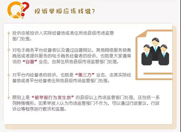 此外,对于日渐增多的电商投诉和举报,《办法》第十二条和第二十七条明确规定了,对电子商务平台经营者以及通过自建网站、其他网络服务销售商品或者提供服务的电子商务经营者的投诉、举报,由其住所地县级及以上市场监督管理部门处理。对平台内经营者的投诉、举报,由其实际经营地或者平台经营者住所地县级及以上市场监督管理部门处理。