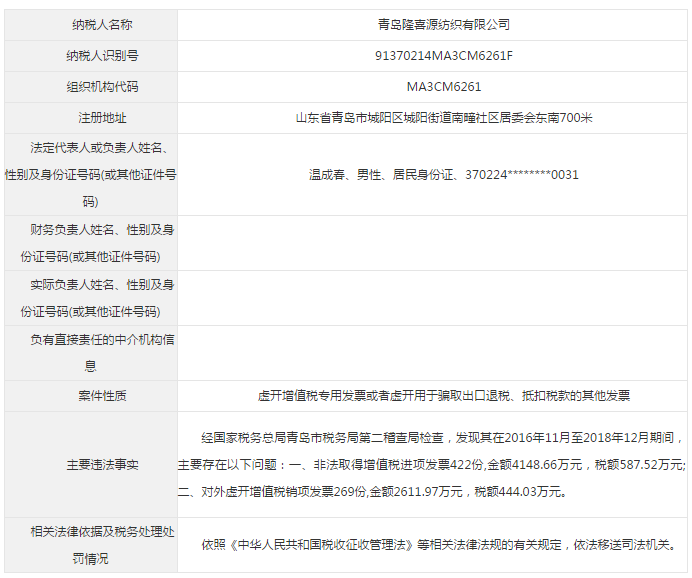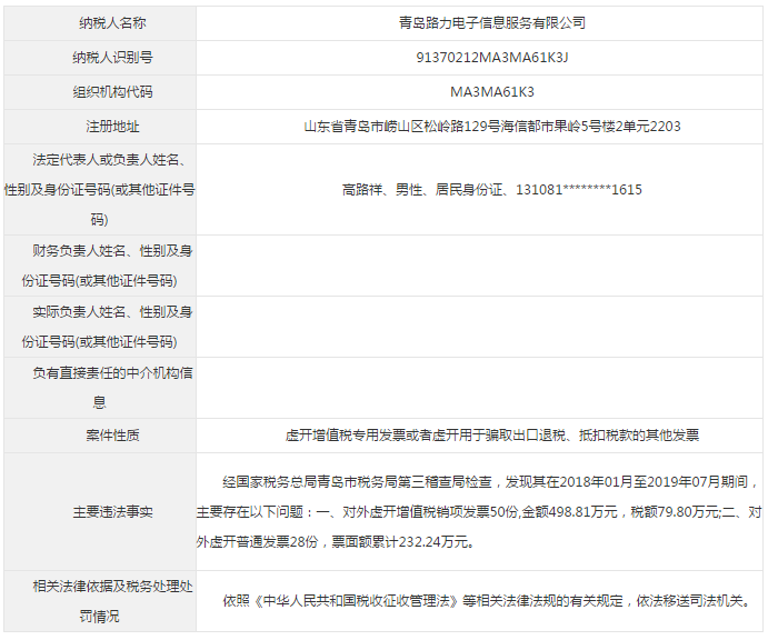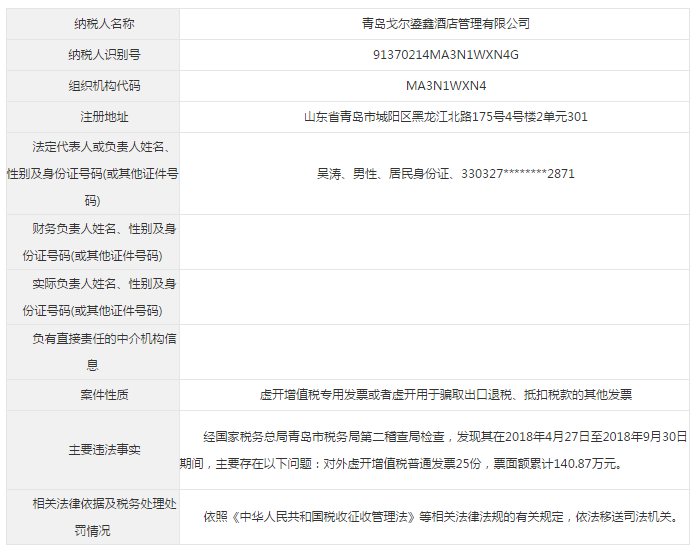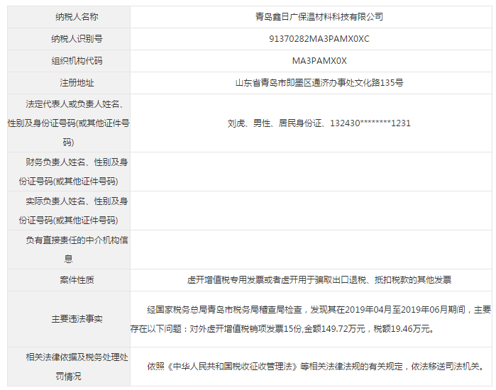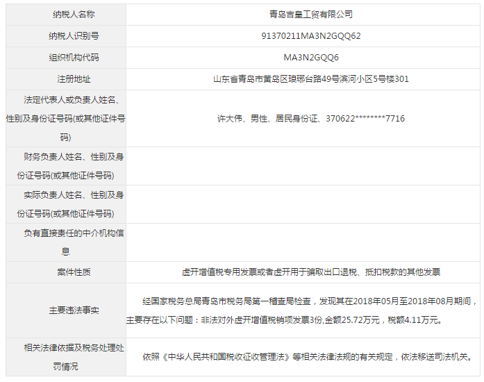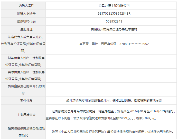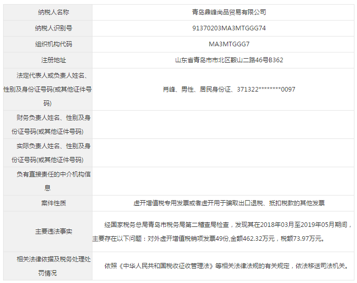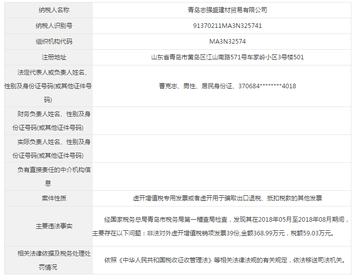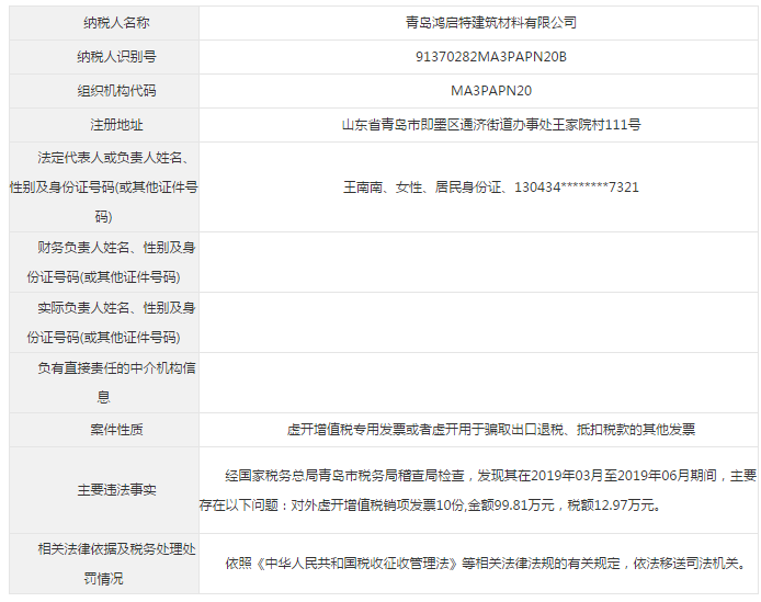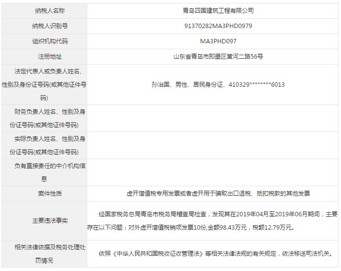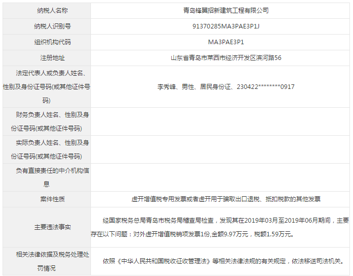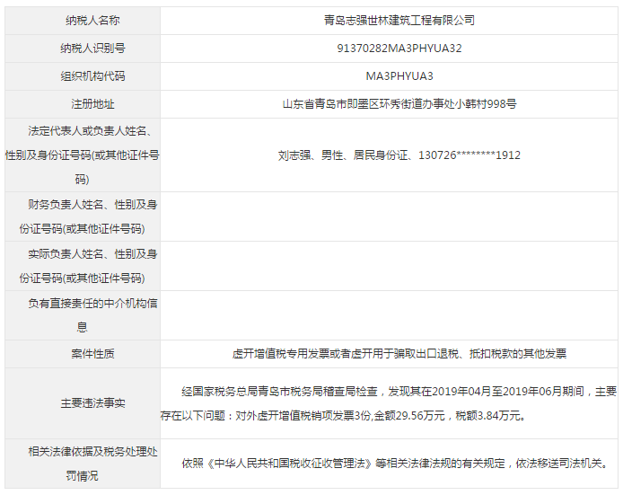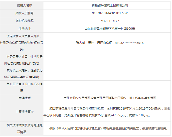 青岛税务局公告青岛占辉建筑工程有限公司等49起重大税收违法案件