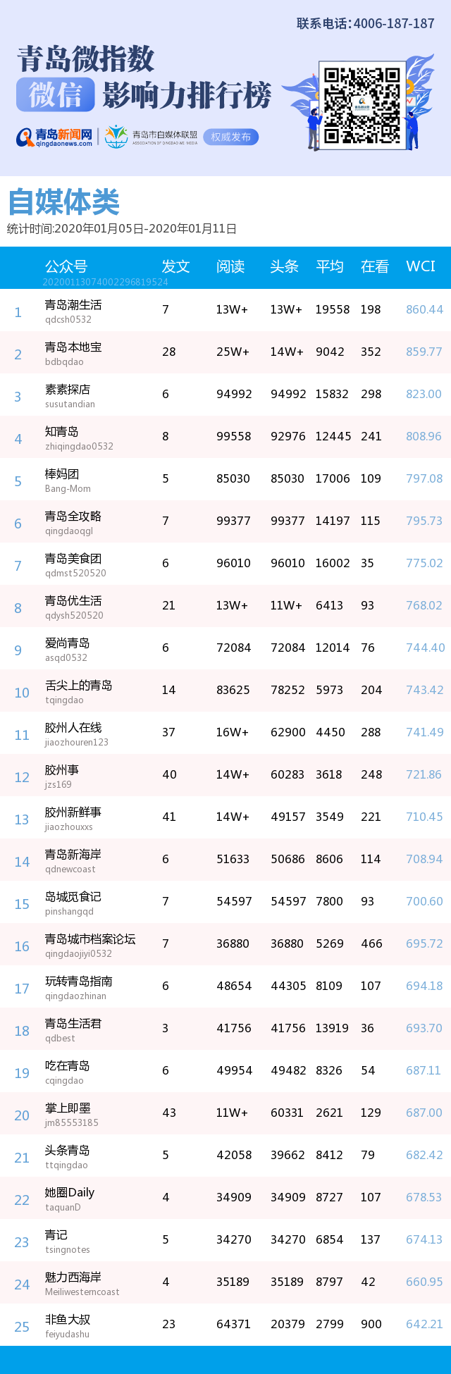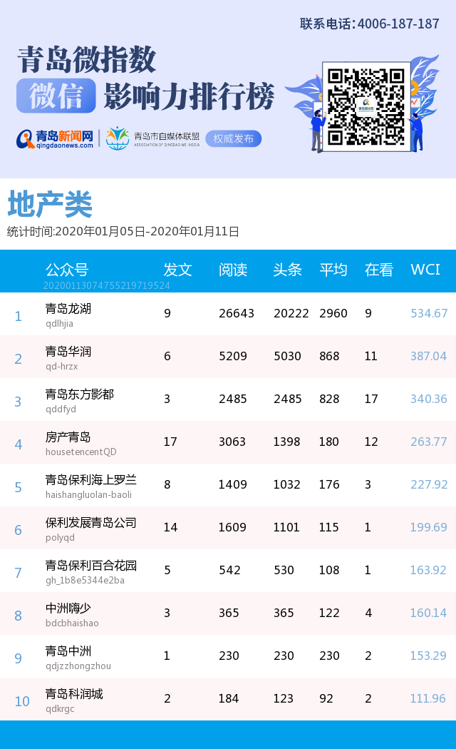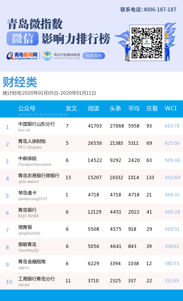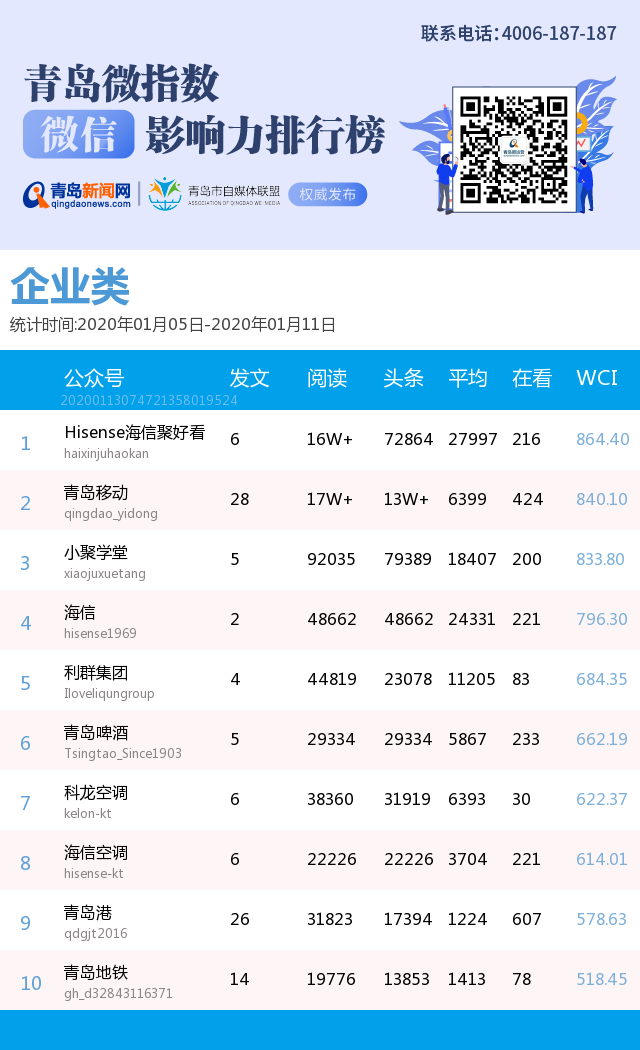 3、本次榜单收录了青岛14个行业微信公众号,如您的账号暂未收录,可联系4006-187-187。