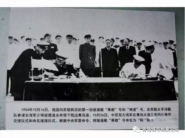 五十年代,中国首次从苏联买来的4艘驱逐舰全部给了后来属于北海舰队的青岛海军基地。1954年10月13日,苏联海军命名为“列什切里内依”号和“列齐威”号的两艘驱逐舰到达青岛3号码头,10月26日,中苏双方进行交接签字仪式和命名授旗仪式。