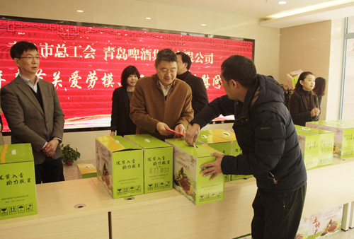 青岛市总工会主要领导、青啤集团相关负责人为到场的困难劳模和困难职工代表发放慰问物资。