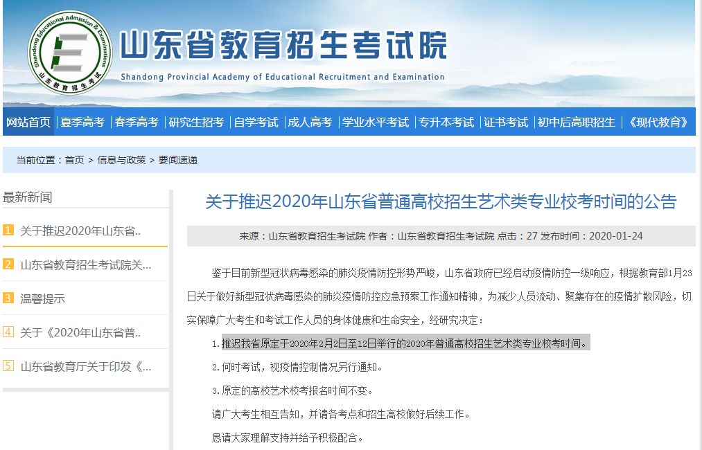 关于推迟2020年山东省普通高校招生艺术类专业校考时间的公告