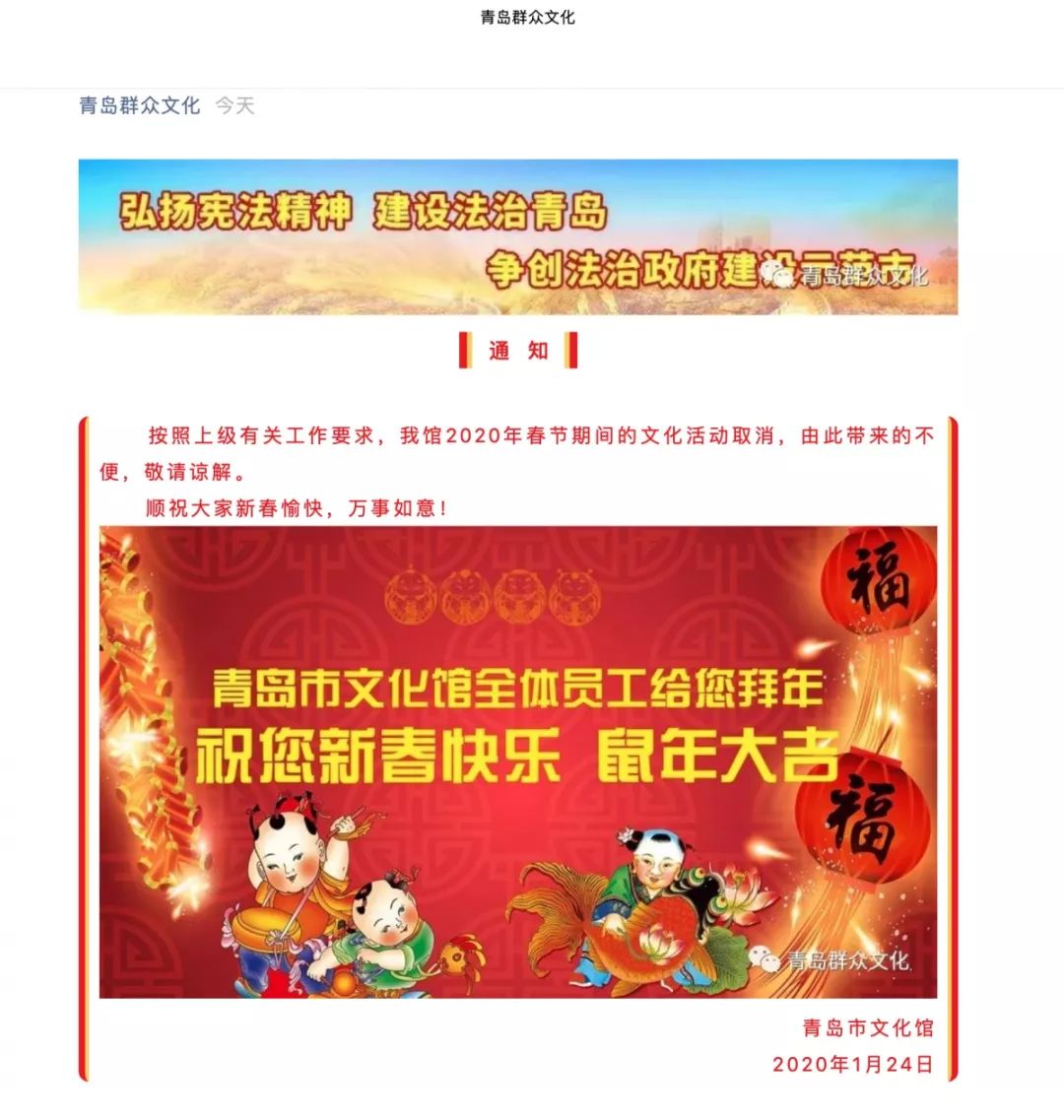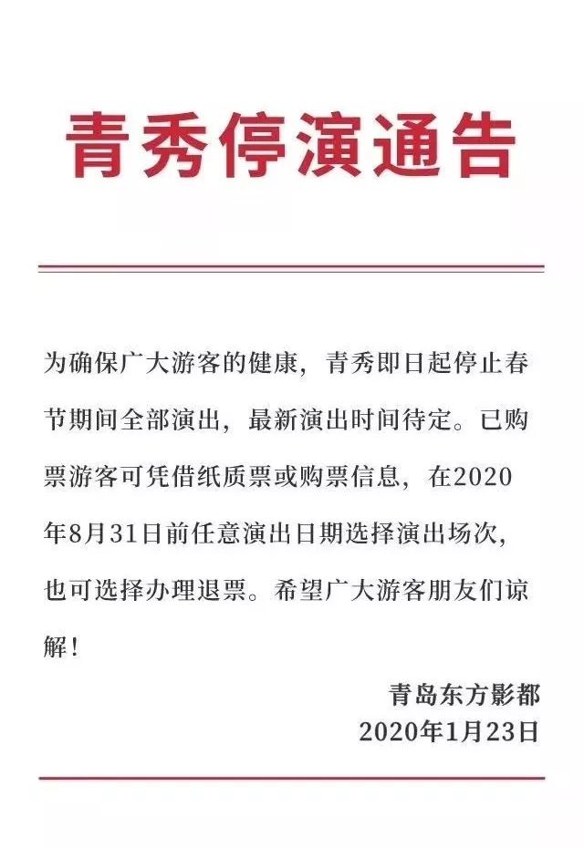 根据国家、省、市新型冠状病毒感染肺炎疫情防控指挥部有关工作部署和青岛西海岸新区新型冠状病毒感染肺炎疫情防控指挥部办公室《关于落实好新型冠状病毒感染肺炎防控有关措施的紧急通知》要求,为有效防范疫情输入和传播扩散,切实保护人民群众的生命安全和身体健康,杜绝公共区域大规模人员聚集可能造成的疫情蔓延风险,经青岛西海岸新区疫情防控指挥部研究,决定自2020年1月23日起,原定在区内举办的各类人员聚集的文旅活动、文化演出等一律取消,具体恢复时间根据上级要求另行通知。给广大市民和游客带来不便,敬请谅解。