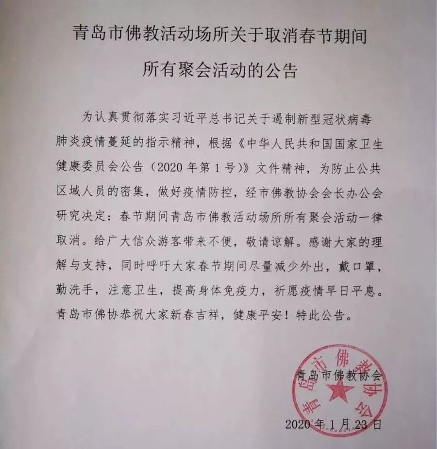 根据《中华人民共和国国家卫生健康委员会公告(2020年第1号)》文件精神,为全力做好新型冠状病毒肺炎疫情的防控工作,切实保护好人民群众的生命安全和身体健康,杜绝公共区域大规模人员聚集可能造成的疫情蔓延风险,经崂山寂光洞庙会现场保障指挥部研究决定,取消2020年正月初八崂山寂光洞庙会。给广大市民和游客带来不便,敬请谅解。