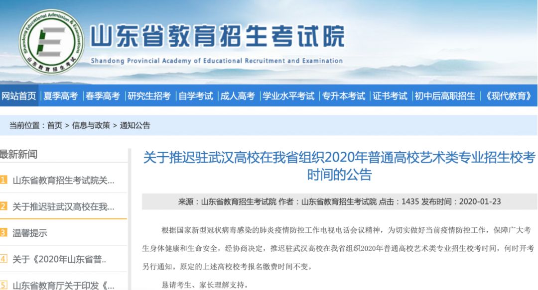为做好新型冠状病毒感染的肺炎疫情防控工作,保障广大考生身体健康和生命安全,经协商决定,推迟驻武汉高校在山东省组织2020年普通高校艺术类专业招生校考时间,何时开考另行通知。原定的高校校考报名缴费时间不变。