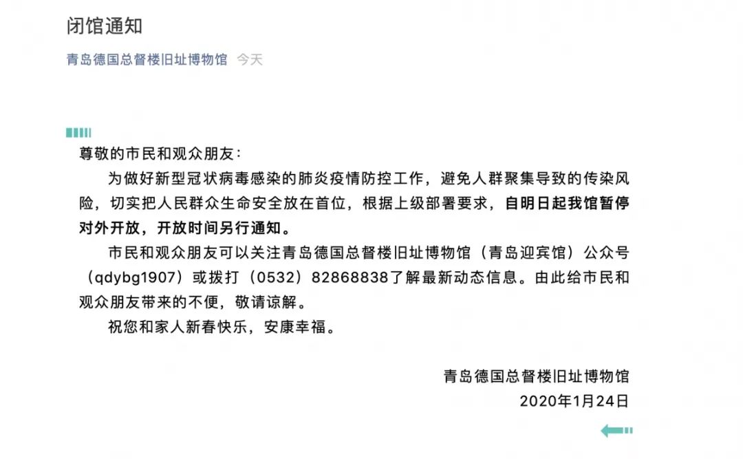 1月24日,记者从青岛市文化和旅游局获悉,截至目前,全市已关闭各公共文化服务机构,包括文化馆、图书馆、博物馆(纪念馆)、美术馆等;停止公共文化演出活动827项;青岛大剧院原定于1月28日-30日(大年初四至初六)晚19:30上演的柳腔《龙凤面》、茂腔《墙头记》、《笑动岛城-青岛曲艺社2020新春相声大会 》三场演出活动已取消;电影院自行暂停营业25家;青岛海底世界等一些室内旅游景区已关闭;旅行社出境游已暂停审批。(早报记者李彦宏)