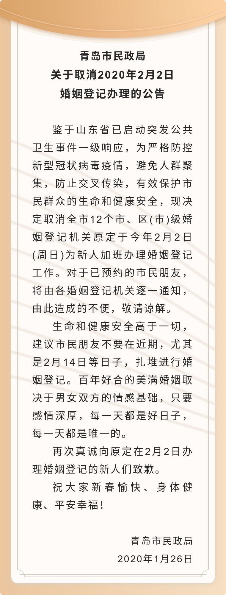 青岛市民政局:取消2020年2月2日婚姻登记办理
