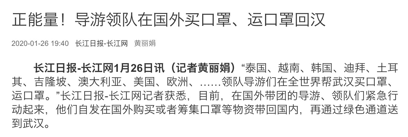 身处世界各地的领队导游都在帮武汉买口罩、运口罩。